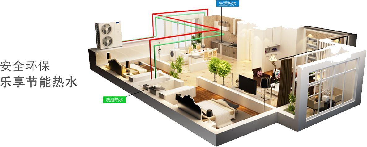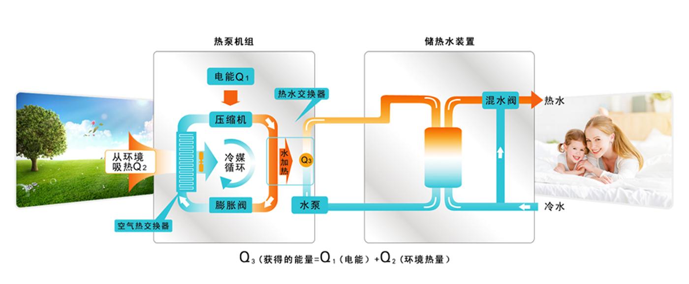 2.稳定,节能:机组通过空气、水源等蓄热获取低温热源,经系统高效集热整合后成为高温热源,用来供应热水,整个系统具有高效节能、绿色环保的特点。