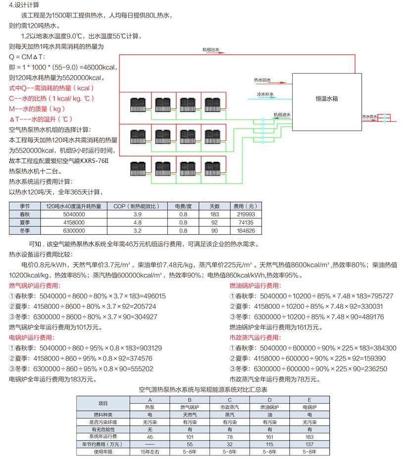 1.工程概况:为提高员工生活水平,该企业建立空气源热泵热水系统为1500名员工提供生活热水。