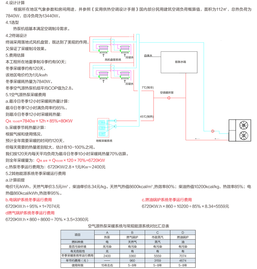 注:上述各表中的相关数据虽不能完全反映全部的运行数据,但可从比较宏观的方面反映出系统主要的运行费用。 B、C、D为锅炉类方案,需增加锅炉的日常维保、检测及管理人员费用,其中天然气管路敷设需要增加开户费用等。A为热泵采暖制冷方案,可实现全年无人管理,系统自动运行,不存在压力容器等高危设备,安全性能较锅炉很强。